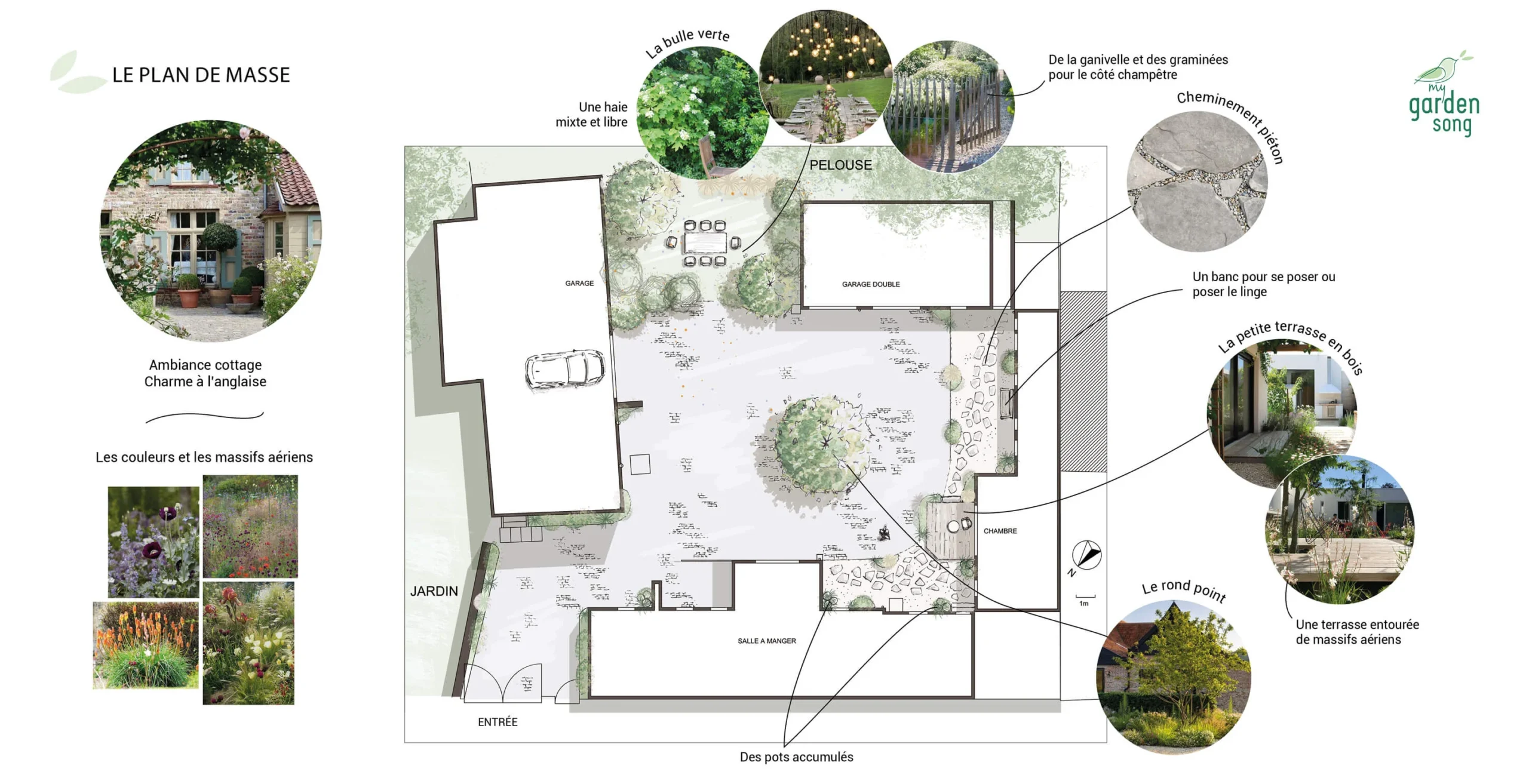 Les propriétaires sont sensibles à l’esthétique des cours et jardins à l’anglaise. L’idée est d’intégrer verdure et matériaux nobles dans cet espace entouré de plusieurs garages.