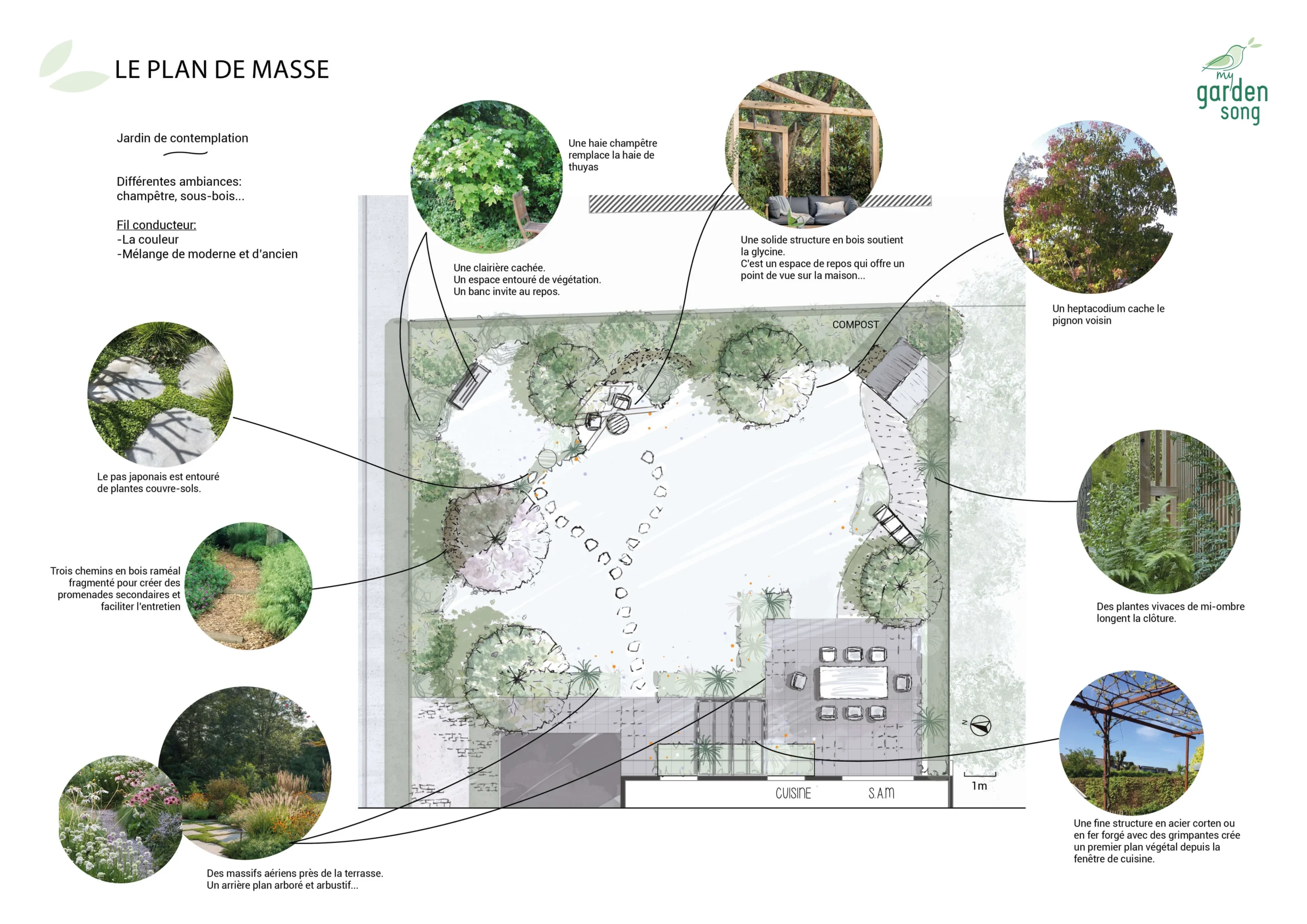 De là est née l’idée de créer un jardin des contemplations. Deux nouvelles zones de repos sont dessinées et offrent un point de vue sur la maison : l’une en forme d’œuf avec un banc, l’autre sous la glycine existante. Des cheminements principaux, en dalles et pas japonais, invitent à la promenade, tandis que des sentiers cachés en copeaux de bois créent la surprise. Ils facilitent aussi l’accès à la nouvelle haie installée devant une clôture en bois.