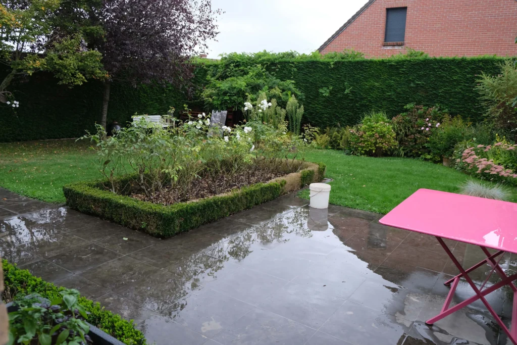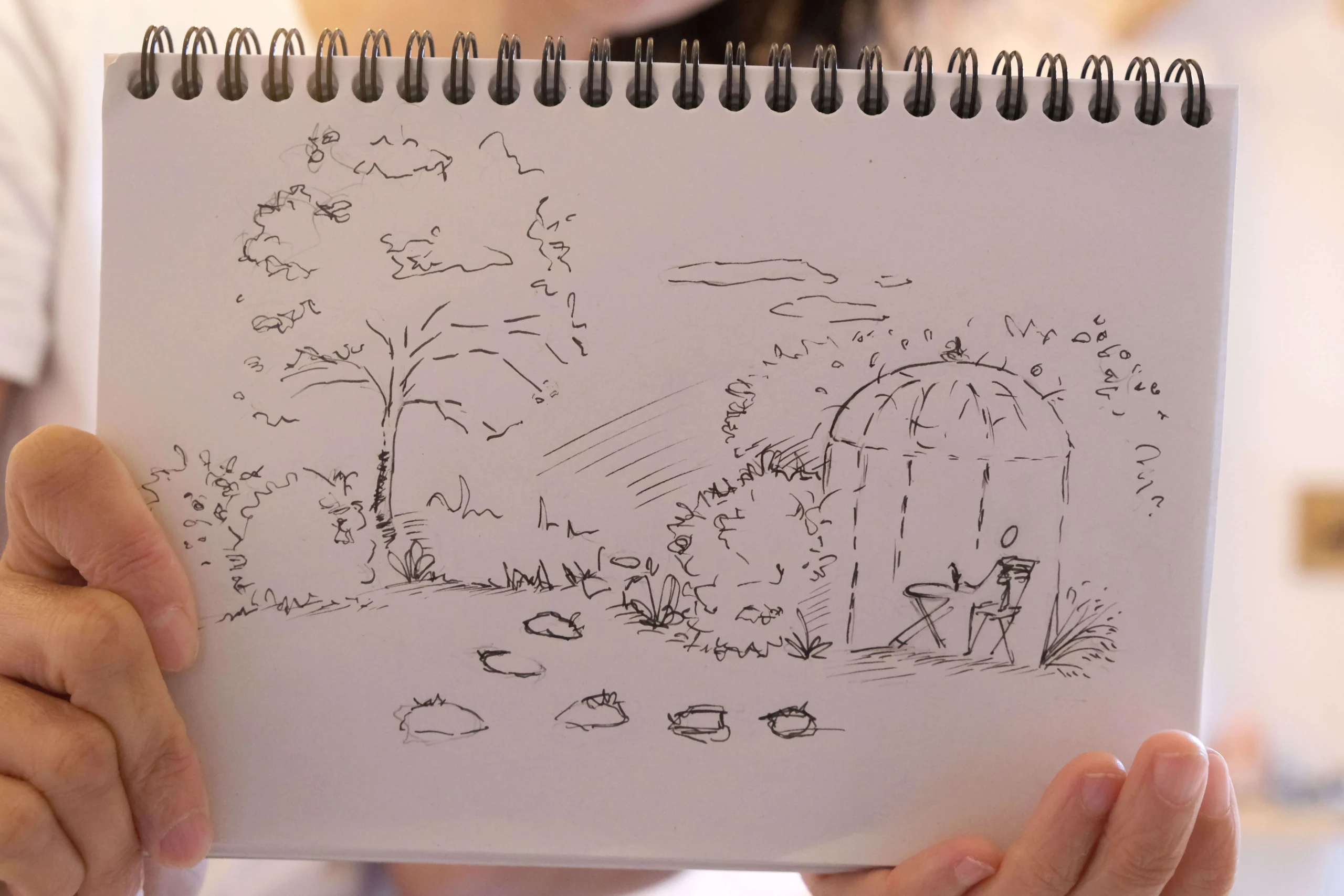 Ce jardin possède déjà beaucoup de charme. Les propriétaires aimeraient le rendre encore plus accueillant et vivant. Ils souhaitent remplacer une haie de thuyas, trop exigeante en entretien, par une végétation plus variée et attirer les oiseaux. Les cheminements et les massifs sont également repensés. Une petite cabane viendra compléter l’aménagement pour ranger les outils. Les propriétaires aiment le mélange du moderne et de l’ancien.